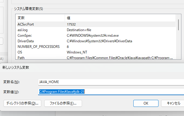 windowsのスタートボタンから環境変数と検索してシステム環境の変数をクリックしてください。その後、右下の環境変数をクリックします。クリック後、システム環境変数の新規をクリックして、変数名を「JAVA_HOME」、変数値を先ほどメモしたインストール先に指定します。